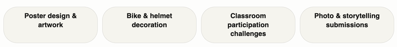 Beyond the rides, every school will host its own Ride Your Bike to School Week Contest. A creative challenge designed to get students excited about active transportation on their own terms. Contest categories include: